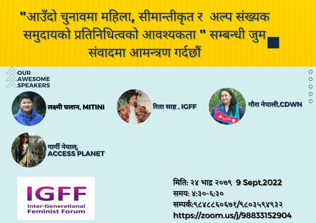 प्यानेलिस्ट लक्ष्मी घलान, रिता साह ,गौरा नेपाली र गार्गी नेपाल ज्युले क्रमश यौनिक अल्पसख्यक, मधेसी महिला, दलित महिला र अपाङग महिला को आगामी चुनावमा प्रतिनिधित्वको सन्दर्भ बारेमा आफ्नो बिचार राख्नु भएको थियो