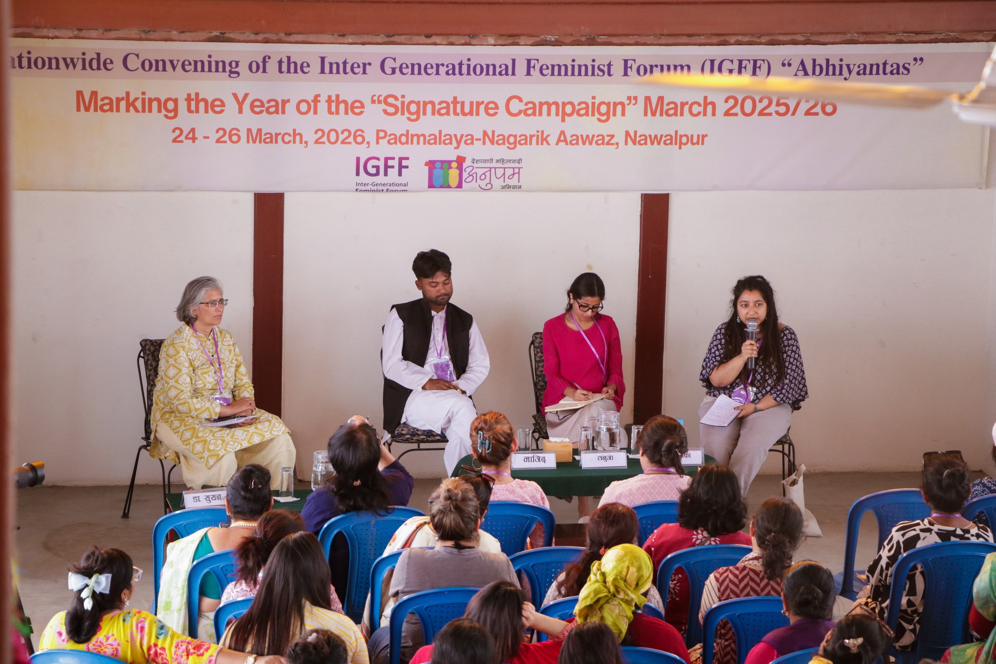 The Intergenerational Feminist Forum (IGFF) convened its third nationwide annual meeting of the Anupam Abhiyan campaign from 24 to 26 March 2026 at Padmalaya, Nawalpur district. The campaign, which entered its third year in 2025, focuses on ensuring women’s political participation at all levels of the state. A significant milestone in 2025 was the coordinated signature handover, urging political parties to commit to 50 percent women’s representation in the 2027 elections. However, Nepal’s political trajectory shifted unexpectedly due to the Gen-Z Jana Andolan, a youth-led movement that disrupted electoral timelines and prompted early elections, highlighting the persistent underrepresentation of women, who constituted only 11.34 percent of First-Past-the-Post candidates.